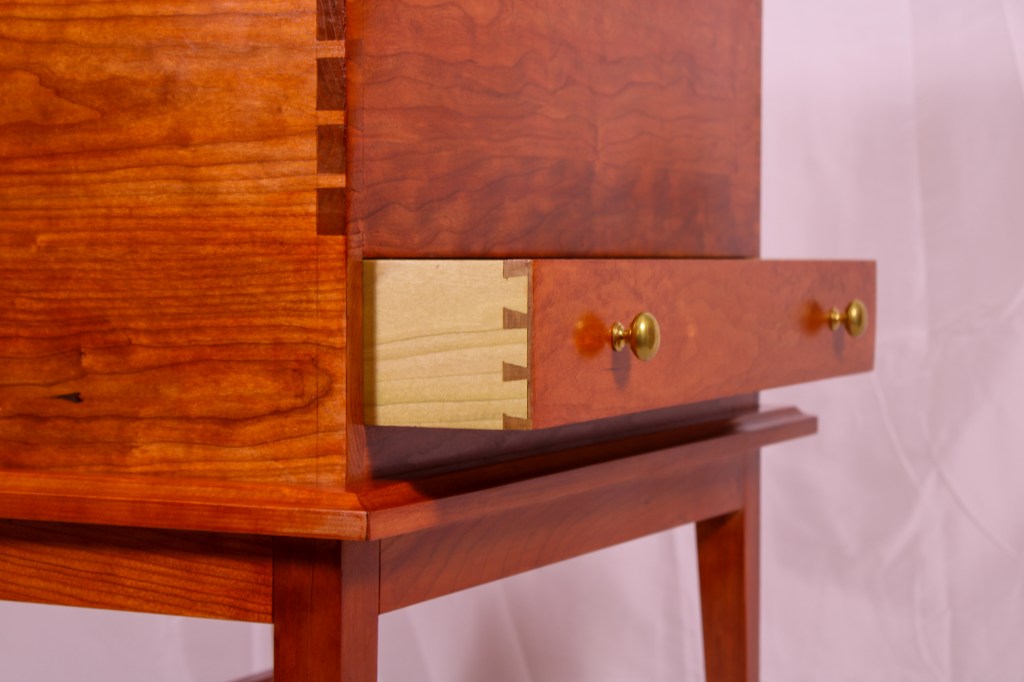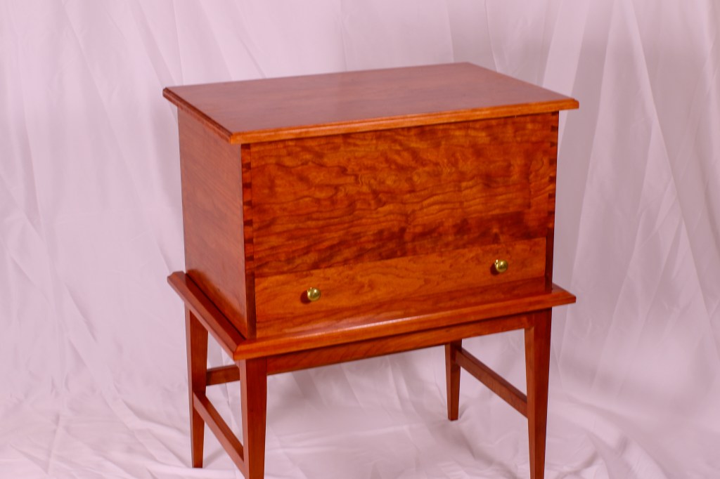 The most stunning aspect of the Shaker Cherry Chest on Stand is the hand cut dovetail joinery. The piece is perfect for storing linens and can fit comfortably in any modern home, especially in a living room or library setting. The chest incorporates styles traditionally seen in Shaker furniture with its sleek lines and cove molding, while also melding contemporary and arts and crafts design elements. The piece is made of solid cherry hardwood which is hand selected and milled in our shop and features brass hardware and hand wrought hinges.